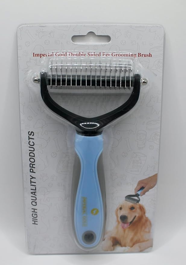 - - Imperial Gold Pet Grooming Brush: Gentle Undercoat Removal: Effectively removes undercoats and loose hair without pulling or cutting fur. - Knots and Mats Solution: Cuts through knots, and eliminates mats without scratching pet skin, easing the grooming process. - No Scratch, No Pain Design: Sharp teeth prevent hair pulling, while rounded ends ensure safety on sensitive skin.