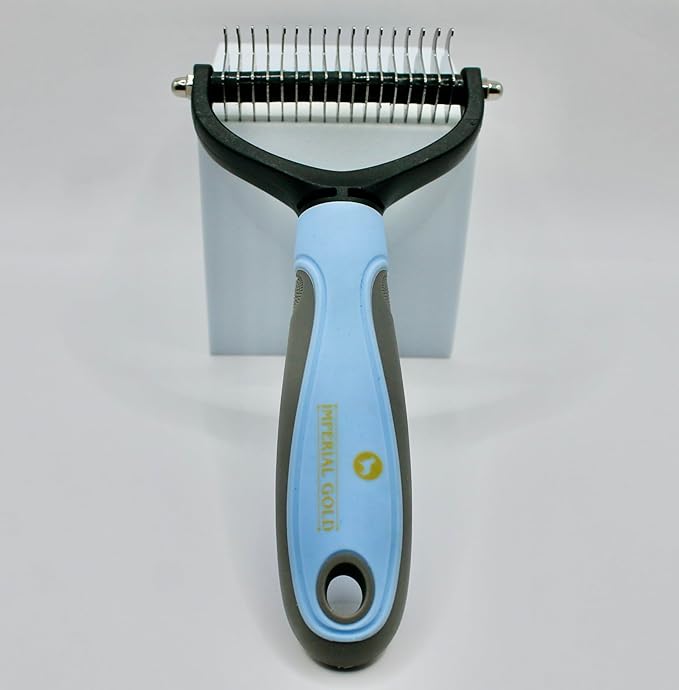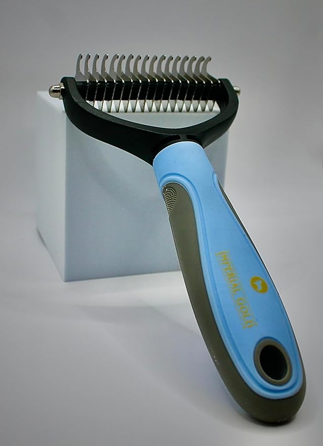 - - Imperial Gold Pet Grooming Brush: Gentle Undercoat Removal: Effectively removes undercoats and loose hair without pulling or cutting fur. - Knots and Mats Solution: Cuts through knots, and eliminates mats without scratching pet skin, easing the grooming process. - No Scratch, No Pain Design: Sharp teeth prevent hair pulling, while rounded ends ensure safety on sensitive skin.