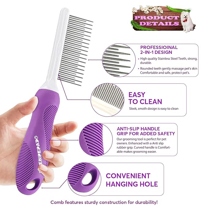 Grooming Comb for Dogs and Cats with Matted Hair, Detangling Pet Comb with Long and Short Stainless Steel Metal Fine Teeth for Removing Mats, Tangles, Knots & Loose Fur from The Undercoat