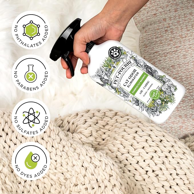 - Naturally Long-Lasting, Light & Fresh: Infused with Bamboo, Jasmine & Pear, this cat freshener spray provides a soft, fresh aroma that won’t overpower sensitive cat (or human) noses, leaving your home smelling fresh & clean.