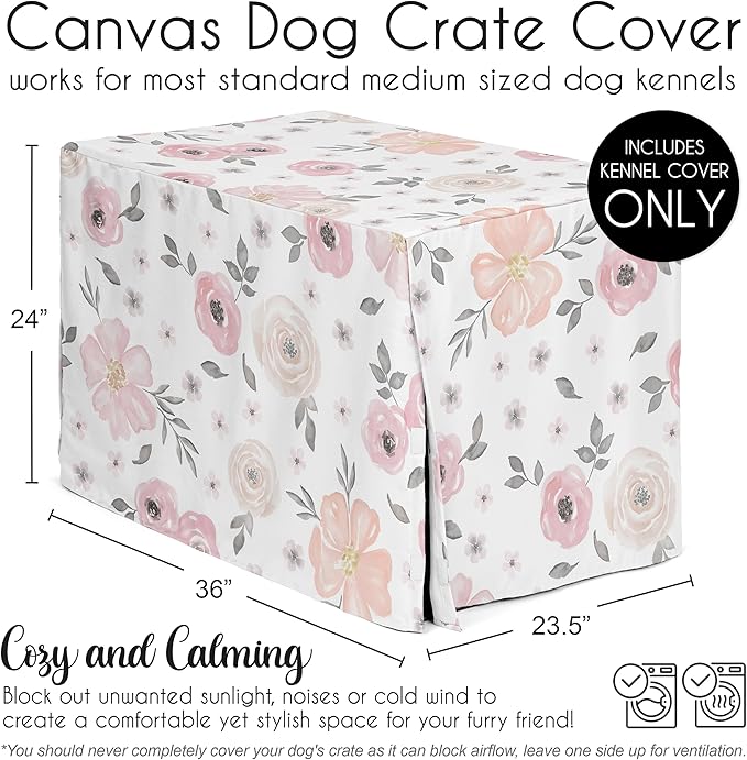 Sweet Jojo Designs Blush Pink Grey Boho Floral Dog Crate Cover – Kennel Covers for 36 Inch Pet Cage Medium - Bohemian Farmhouse Shabby Chic Rose Lily Watercolor Flower Elegant Gray and White