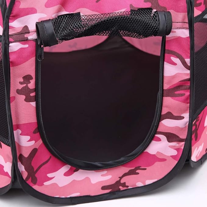 - Design Features: Roomy 8 Panel collapsible Design puppy playpen with protected seams and reinforced corners allows for extremely easy set up and take down. Removable zipper top half mesh half shaded design and zipper door with velcro provides easy in/ out access for your pet. Side pockets also make convenience for personal little items etc.