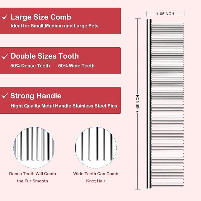 - STAINLESS STEEL COMB 2-IN-1 DESIGN - Sparse teeth to loosen tangled hair & comb large fluffy hair, also can be styled for dogs; dense teeth to comb eyes ears, nose & fine hair on legs; rounded pins with smooth stainless steel to effectively prevent static electricity & tangled hair when combing.