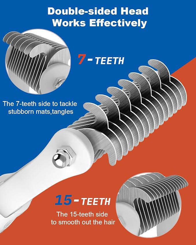 - ๐๐จ๐ฎ๐๐ฅ๐-๐๐ข๐๐๐ ๐๐ง๐๐๐ซ๐๐จ๐๐ญ ๐๐๐ค๐ ๐๐จ๐ซ ๐๐จ๐ ๐ฌ: First, tackle the stubborn mats, tangles, and knots with the 7-teeth side; then, thin and deshed the hair and fur with the 15-teeth side
