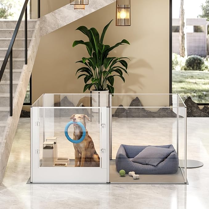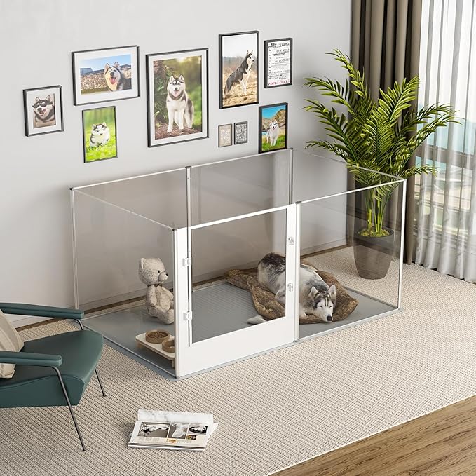 - Clear Acrylic Fence Design - Crystal-clear acrylic dog fence playpen enables you can interact with your pets closely, 360° high transparency and wide vision, it’ll relieve your pets from anxiety, they also make sure you are by their side, equipped with a door for dog mom/ pets to come and go easily, so this is a unique gift for your loved friends, get this fence in the room, instantly improve the overall interiors