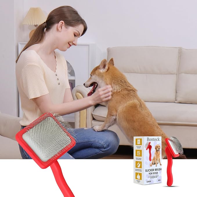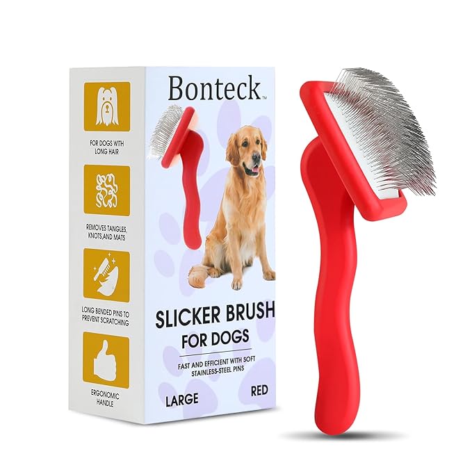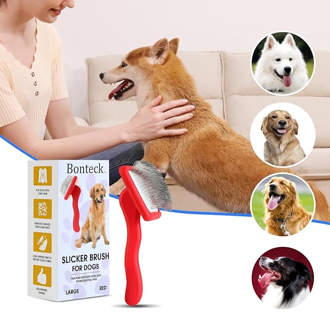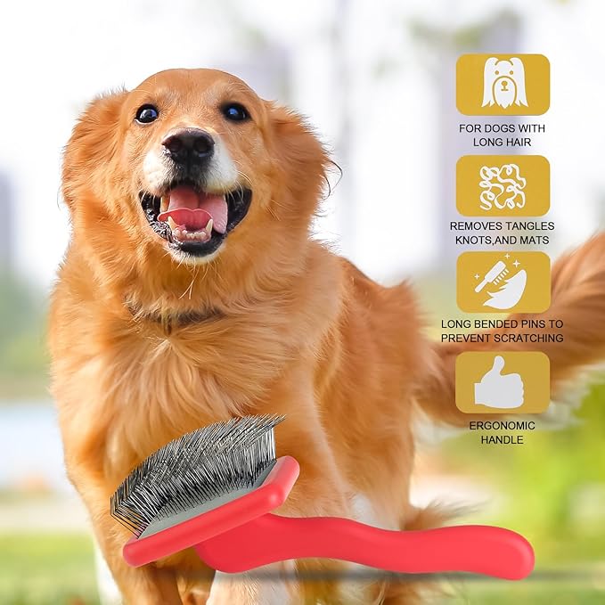 Slicker Brush for Grooming Long-Haired Dogs like Poodles, Goldendoodles, Labradoodles - Large Size Dematting Pin Brush for Pet Hair (Red)