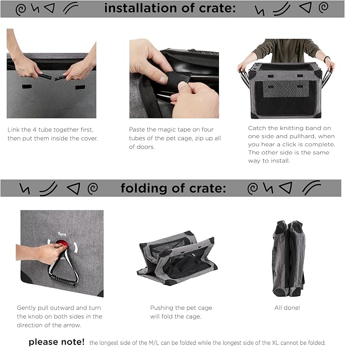 - M/L Size Installation: Tips: The dog crate installation for M/L size has one more step than XL: link the longest side. Please watch our provided installation video, which will assist you with your installation. When installing the M/L size dog cage for the first time, just connect the longest side once, from then on, it can be used the same way as the XL size.