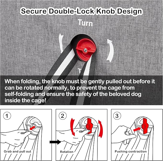 - Safety knob & Zipper & Leash: To ensure the safety of your beloved dog inside the crate, our knob is designed with a two-step locking mode. When folding, you need to gently pull it out before you can rotate it normally, to prevent the crate from suddenly folding. The safety leash inside our dog crate clips onto your dog's collar to ensure they stay safely inside it. It also comes with a heavy-duty self-buckling zipper for added security.