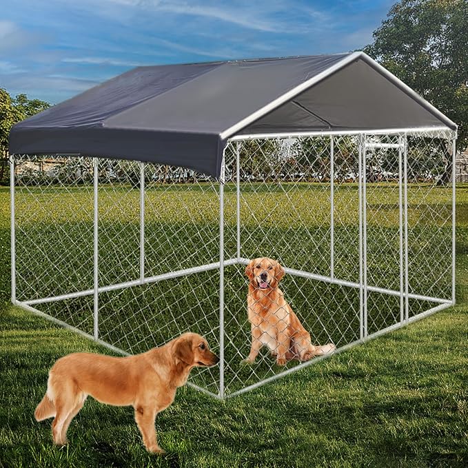 Large Dog Kennel 9.8X9.8FT, Large Outdoor Dog Kennel Heavy Duty Dog Cage with Waterproof UV-Resistant Cover Roof, Large Dog House Pen Enclosure, Silver