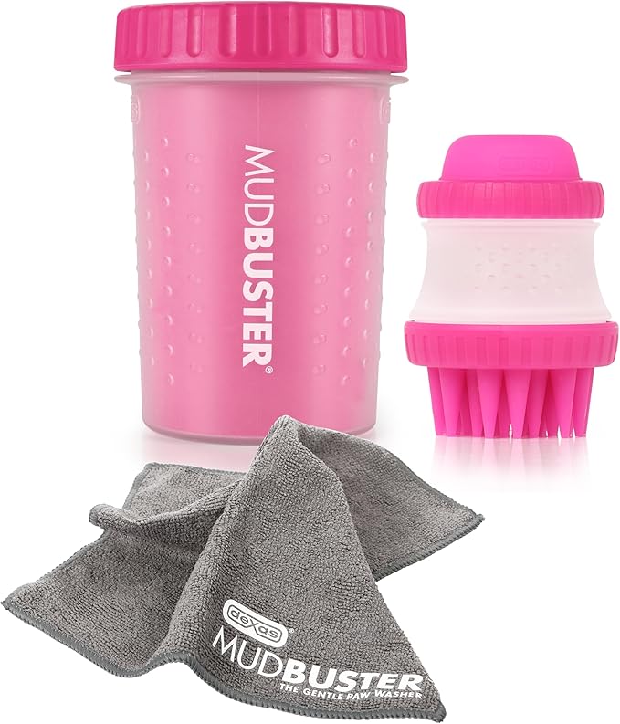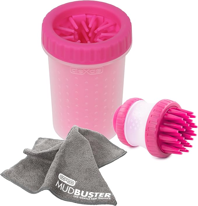Dexas MudBuster Portable Pet Cleaning Kit with Dog Paw Washer, Pet Bathing Brush, Microfiber Towel, Medium, Pink