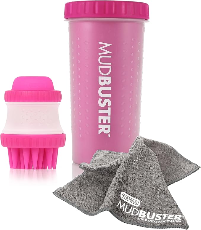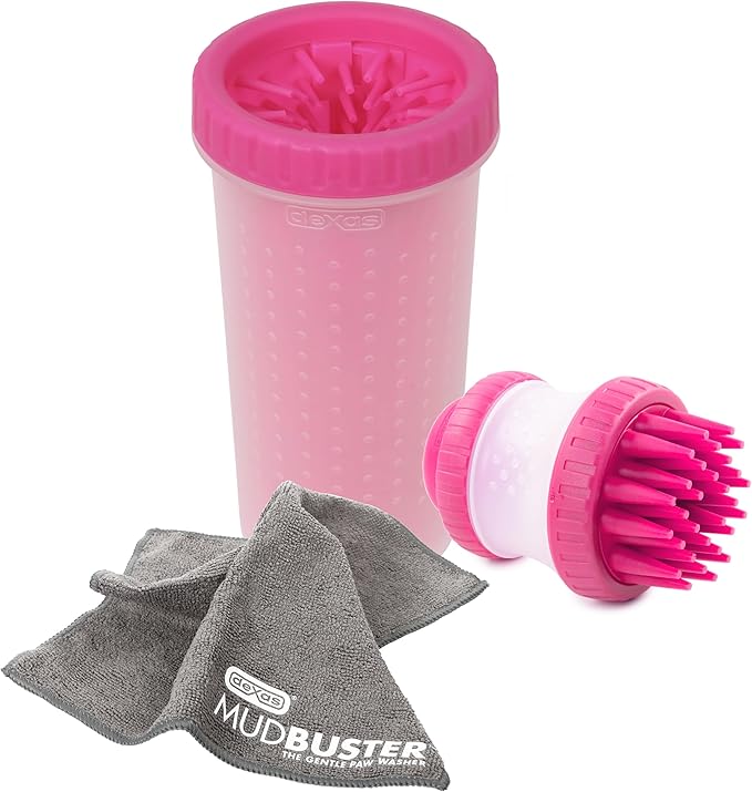 Dexas MudBuster Portable Pet Cleaning Kit with Dog Paw Washer, Pet Bathing Brush, Microfiber Towel, Large, Pink