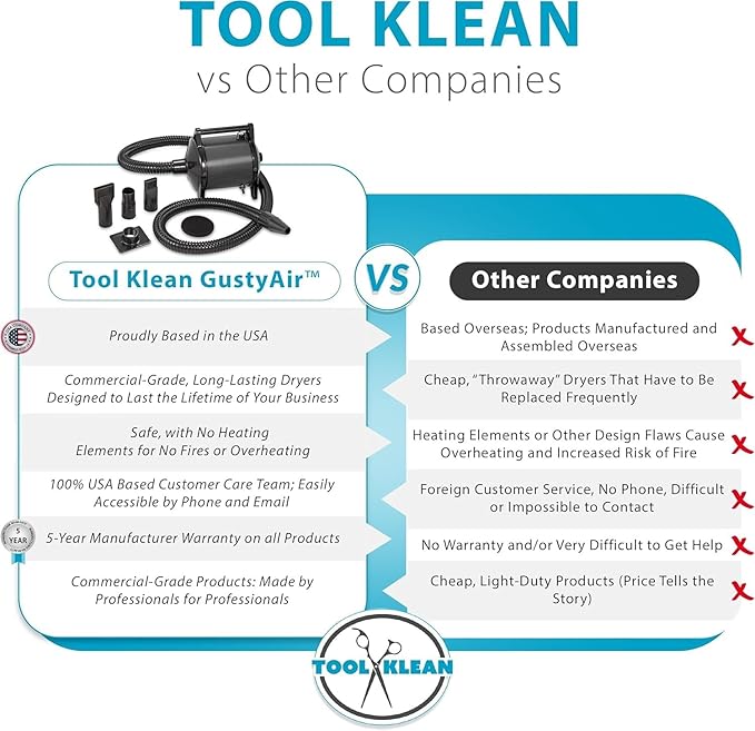- ⚡【Grooming Equipment Should Last】The GustyAir Mini dryer features a long-lasting Ametek motor, designed in the USA and assembled in Mexico. These are not cheap, throwaway dryers, and they are not made in China. Small yet powerful, and featuring reusable filters and easy maintenance brushes, they are built to live for years and years. Invest once and know your grooming business is in good hands with GustyAir.