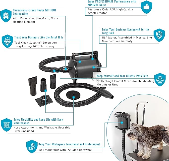- ⚡【Enjoy Commercial-Grade Grooming Versatility】All GustyAir dryers are wall mountable and include reusable filters and several blower attachments. Choose the Pro Air II for maximum power and speed variability, without overheating, with its dual, individually controlled motors. Choose the Pro Air for commercial-grade power and durability at a moderate price-point. Or choose the GustyAir Mini as a great budget-conscious professional option for beginning groomers and small space businesses.