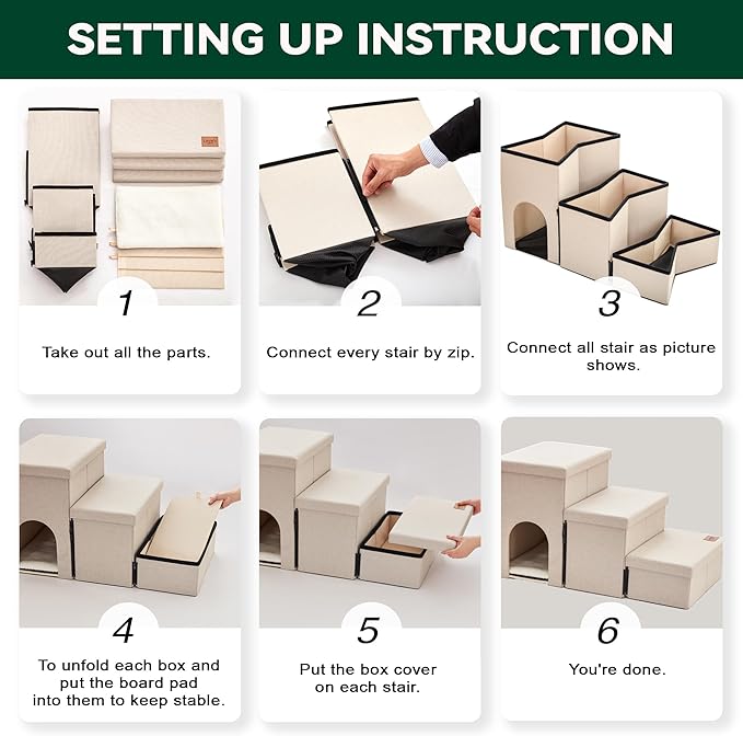- EASY ASSEMBLY AND PORTABLE: Love's cabin dog stairs come with detailed assembly instruction video, making it quick and convenient to install.You can use the zipper to link the steps together and add the bottom pad for a sturdy dog stairs.When not in use, you can simply fold the steps away.