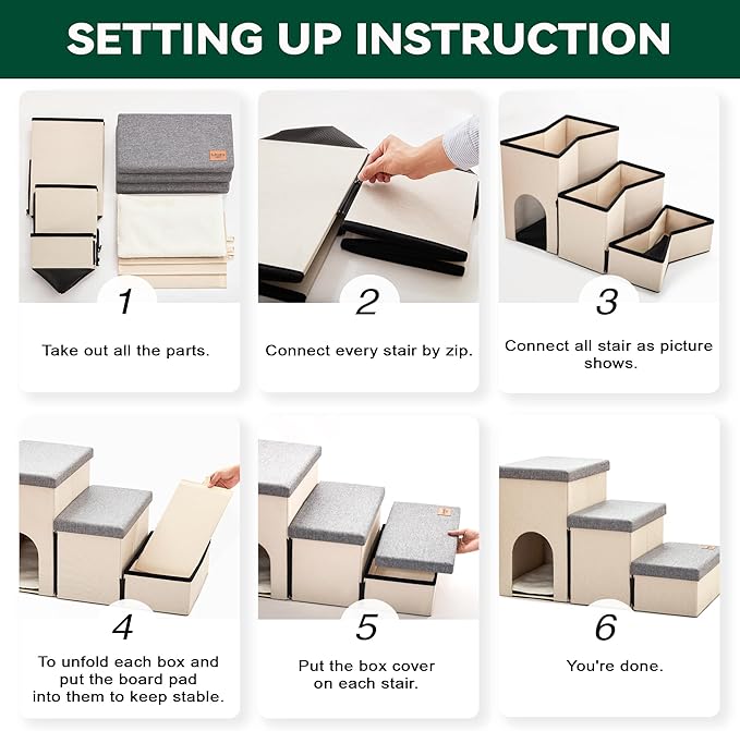 - EASY ASSEMBLY AND PORTABLE: Love's cabin dog stairs come with detailed assembly instruction video, making it quick and convenient to install.You can use the zipper to link the steps together and add the bottom pad for a sturdy dog stairs.When not in use, you can simply fold the steps away.