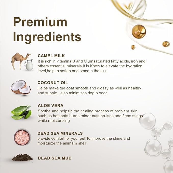 - [Dead Sea Mud and Minerals): Harnesses the natural properties of Dead Sea mud and minerals to gently cleanse and soothe your dog's skin, providing relief from itching, irritation, and inflammation.