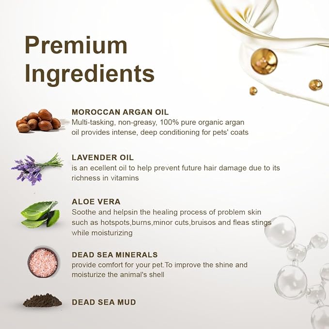 - [Dead Sea Mud and Minerals): Harnesses the natural properties of Dead Sea mud and minerals to gently cleanse and soothe your dog's skin, providing relief from itching, irritation, and inflammation.