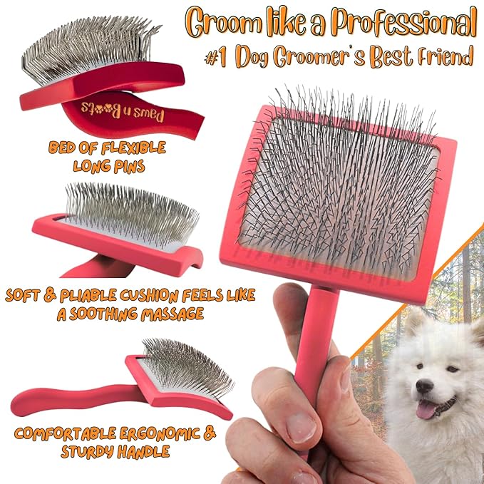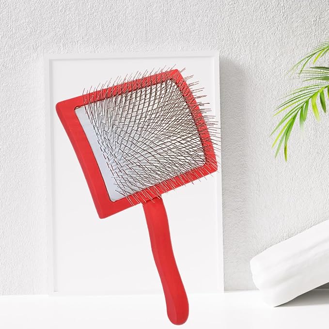 Pro-Slicker Brush Grooming Tool for Pets: Large Red Brush, Soft Cushion Bed of Dull Pins, Gentle but Effective. Easily and Painlessly Remove Thick Undercoat. Reduce Brushing Sessions, Groom like a Pro