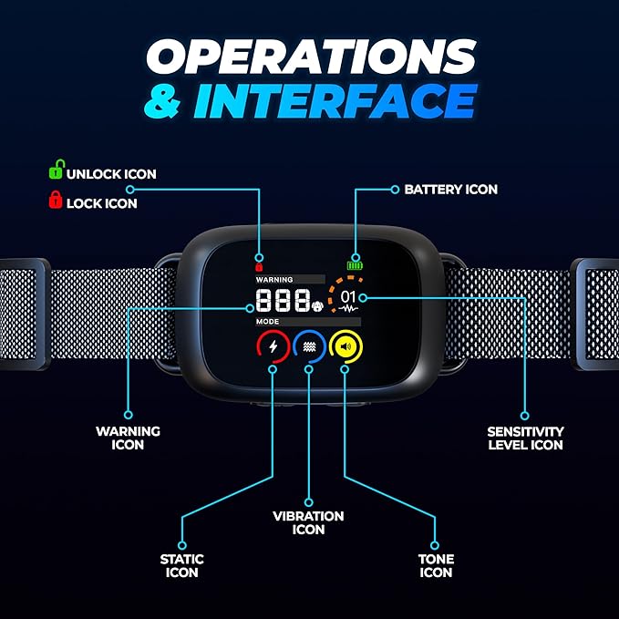 - Easy-to-Use Display & Controls. Features a color TFT display showing the collar’s status and power level, with a simple M button to switch between modes and sensitivity levels for convenience.