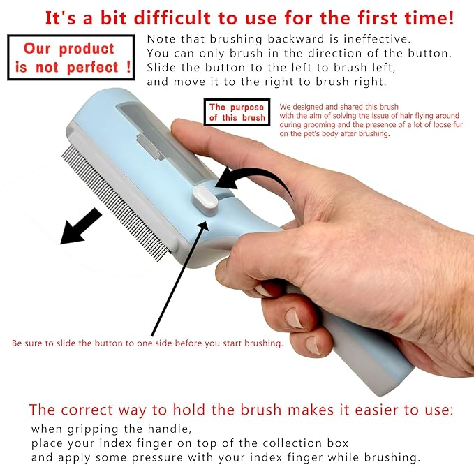 - 🐾 Our brush isn't perfect: First off, you might find it a bit tricky the first time you use it. You must slide the button to one side and then only brush in the direction of the button; brushing the wrong way won't be effective. Additionally, the hair caught on the two rows of steel pins needs to be manually removed; it cannot be collected into the recycle box. However, we believe that once you become adept at using this comb, you will find it more useful than a cat steam brush or steamy dog brush.