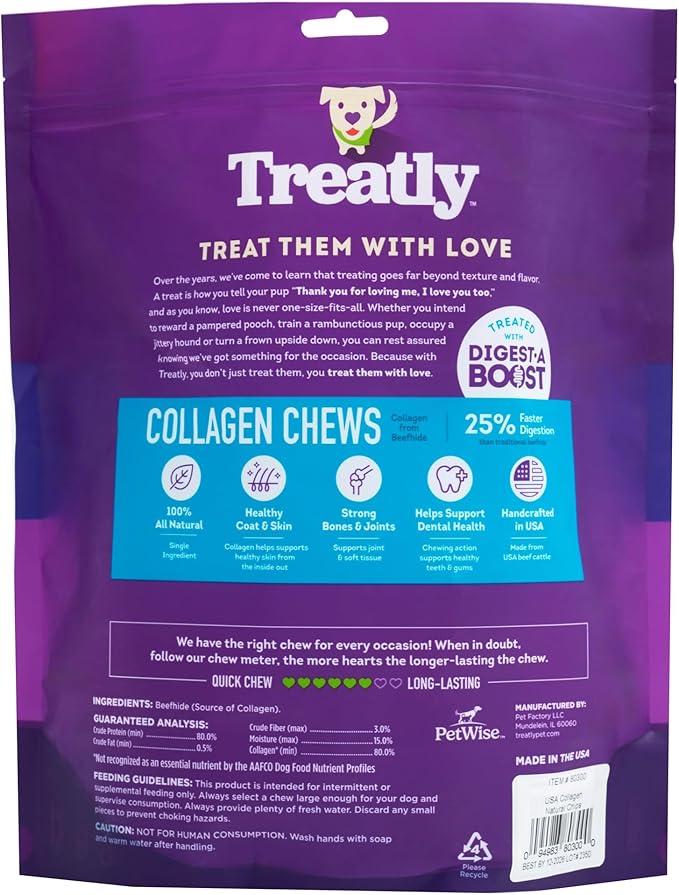 - FOOD SAFETY: Treatly beefhide chews are made in our Global Food Safety Initiative-certified manufacturing facility, which gives customers peace of mind in knowing that our products are produced under optimum safety and quality conditions