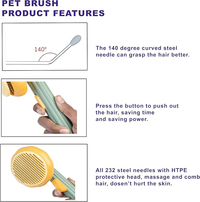 - UPGRADED PET FUR BRUSH - The 140°bent needle is more in line with the standard of safe use for cats, penetrate deep into the undercoat and grasp loose hair easily. This self cleaning cat brush with 232 stainless steel needles with protection points is 1.3 times as thick as bristles of other deshedding brush for cats, more sturdy and not easy to deform, can be used for a longer time. Prevents pet hair static electricity.