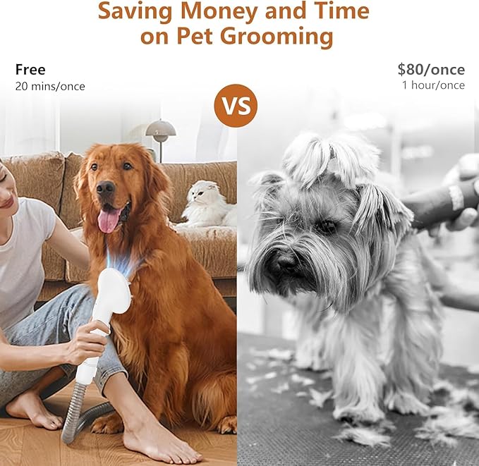- 5 IN 1 PET VACUUM GROOMING KIT:The Dog Grooming Kit is designed to provide all the necessary tools for grooming your beloved pet.come with 5 proven tools. Use the daily grooming brush and the de-shedding tool to remove loose hair and eliminate tangles. The cleaning nozzle and cleaning brush can collect pet hair falling on the clothes, carpet and hard-to-reach areas. Make home grooming easy.