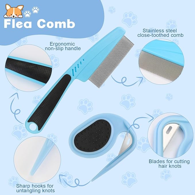 - [Economical Pet Flea Comb Set]: This set includes a flea comb and a knotting comb, offering an economical solution for quick pet grooming. It efficiently removes fleas, eye debris, and tear stains, enhancing your pet's appearance.