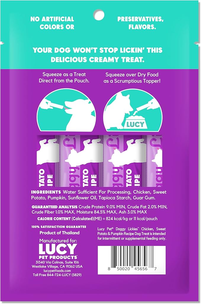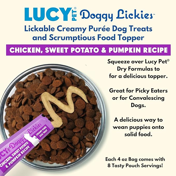 - Lucy Pet Doggy Lickies are a scrumptious lickable treat you can serve directly from the pouch or over Lucy Pet dry dog food
