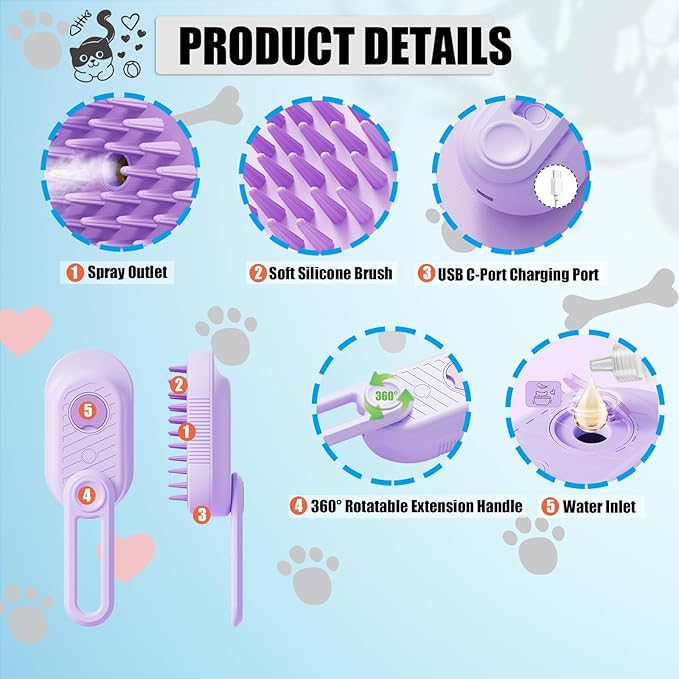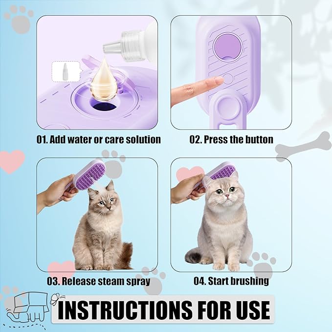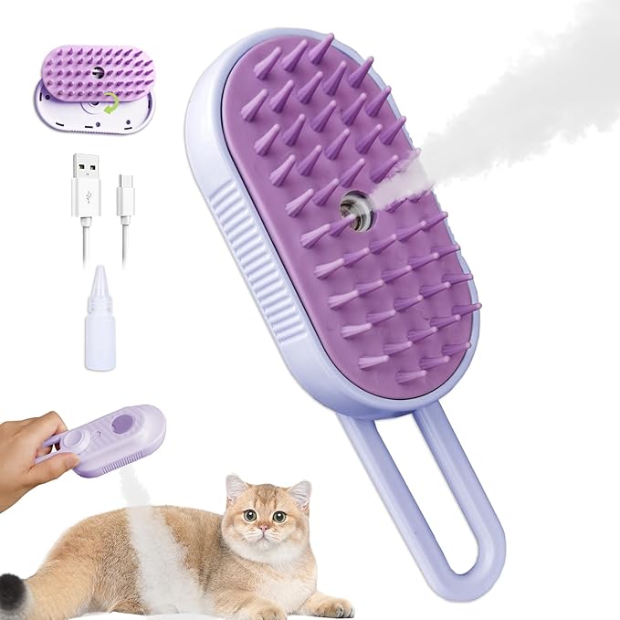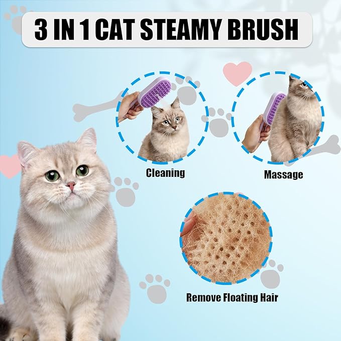 - 😺 [3 IN 1 DOG STEAMY BRUSH]: Cleaning, massaging and remove the floating hair. The new steamy brush for cats helps to gently remove tangled and loose hair while providing a soothing massage for your furry pet, leaving them feeling relaxed and rejuvenated after each grooming session.