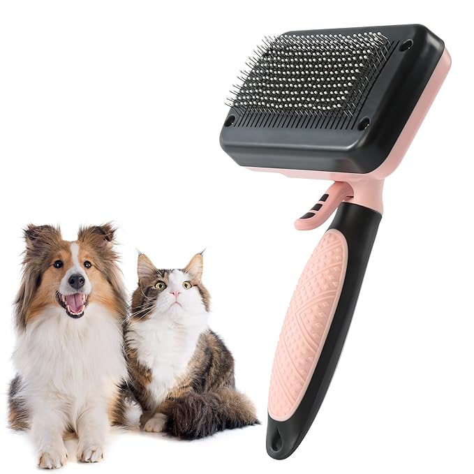 Dog & Cat Hair Brush,Self Cleaning Slicker Brush for Long Short Hair,Shedding & Grooming Pet Brush with Soft Bristle and Release Button,Pink