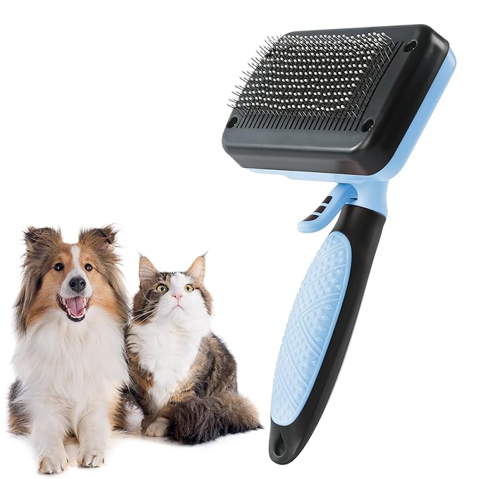 Dog & Cat Hair Brush,Self Cleaning Slicker Brush for Long Short Hair,Shedding & Grooming Pet Brush with Soft Bristle and Release Button,Blue
