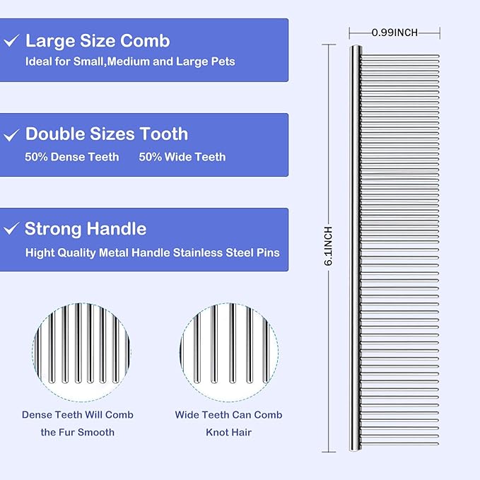 - STAINLESS STEEL COMB 2-IN-1 DESIGN - Sparse teeth to loosen tangled hair & comb large fluffy hair, also can be styled for dogs; dense teeth to comb eyes ears, nose & fine hair on legs; rounded pins with smooth stainless steel to effectively prevent static electricity & tangled hair when combing.