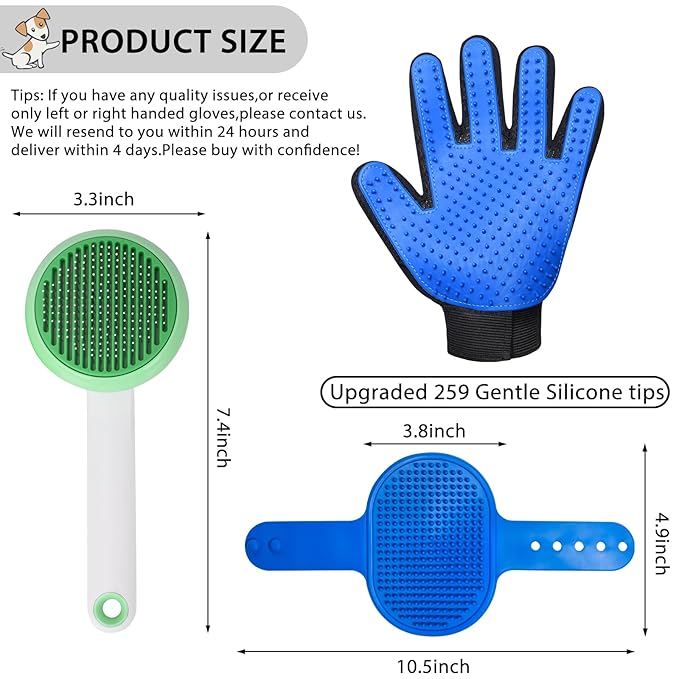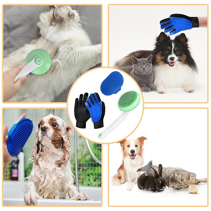 - Perfect Grooming Combination:1 pcs Dogs Cats Brush,1 pcs Dogs Cats Grooming Glove,1 pcs Dogs Cats Bath Brush;The grooming kit can be used short, medium and long, thick, thin and curly haired pets,let your pet’s coat soft and shiny
