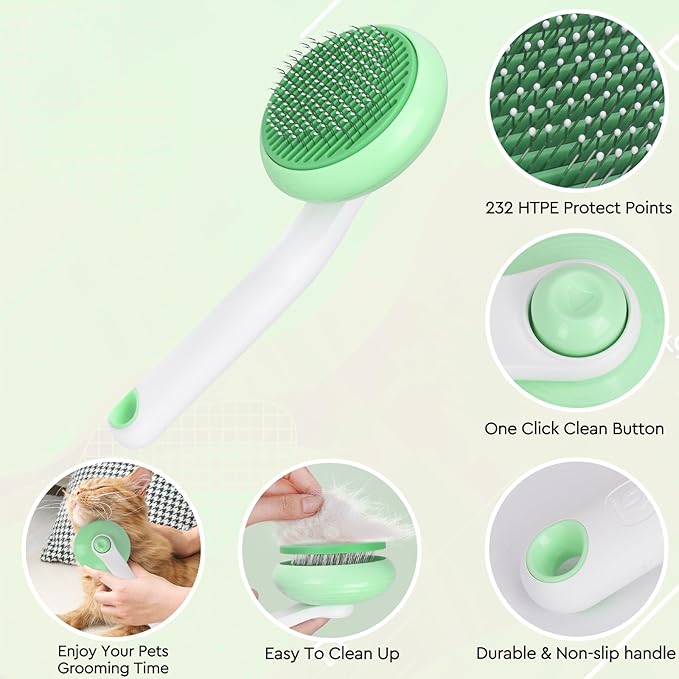 - One click Cleaning Button and Non slip Handle:You just have to Simply click the button,and the pet hair will be pushed out of the brush;The non slip rubber and ergonomic handle includes a silicone, slip resistant grip that is comfortable to use;It is more convenient and efficient to use