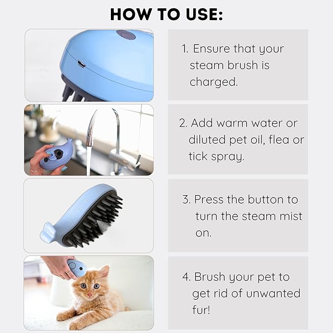 - 💧 Easy to use - Simply fill with water or dilute with pet oil or bug sprays, and turn on to allow a mist. USB cord included to recharge the steamy cat brush. Battery time lasts about 1 week.
