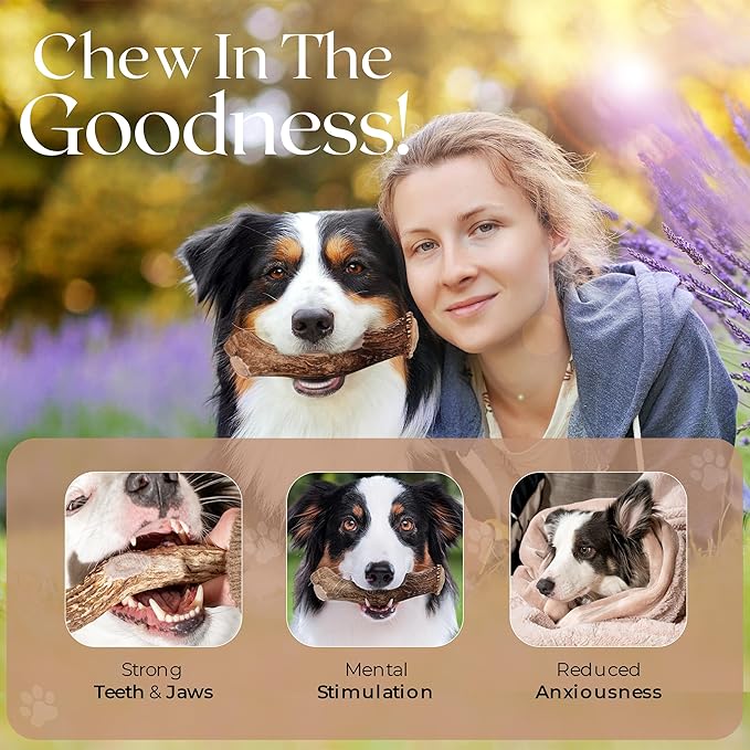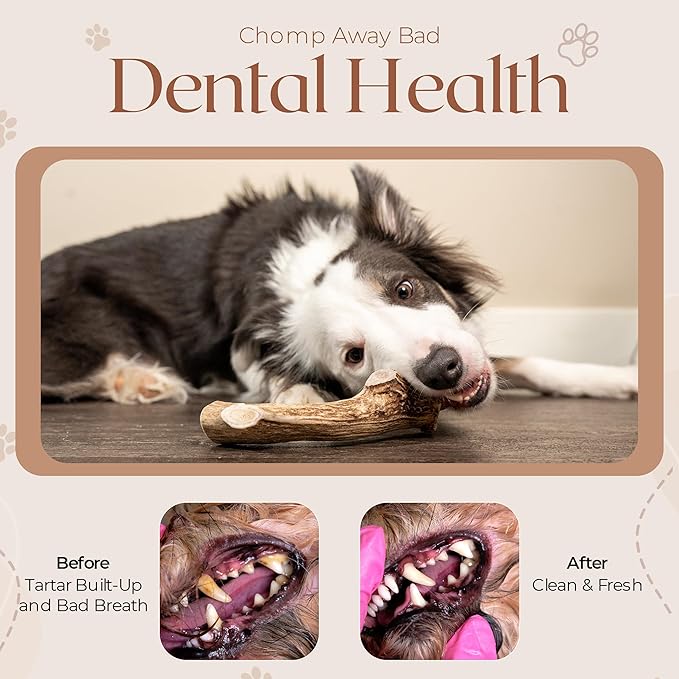 - Dental Health: Chewing on deer antlers can help promote dental health by reducing plaque and tartar buildup on your dog's teeth. The chewing action also helps massage the gums, which can contribute to overall oral hygiene.