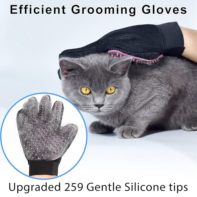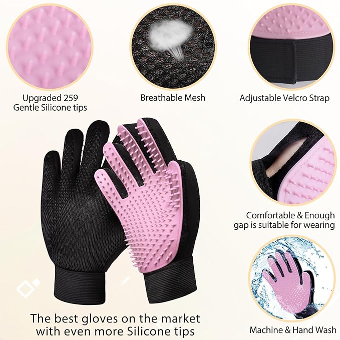 - [Pet Hair Remover Glove]:With enhanced 259 silicone grooming tips, an enhanced five-finger design for a soft and relaxing massage,the back of the glove has a soft mesh design,good ventilation,fits all pet owners thanks to the adjustable wrist strap,moreover,it’s machine washable.