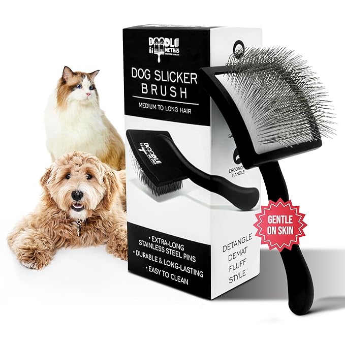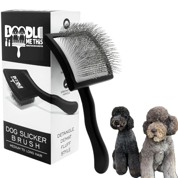 Slicker Brush for Goldendoodles and Long Haired Dogs Black Finish Long Stainless Steel Pins for Detangling and DeMatting Grooming Tool for Home by Doodle Me This Kingston and Hamilton