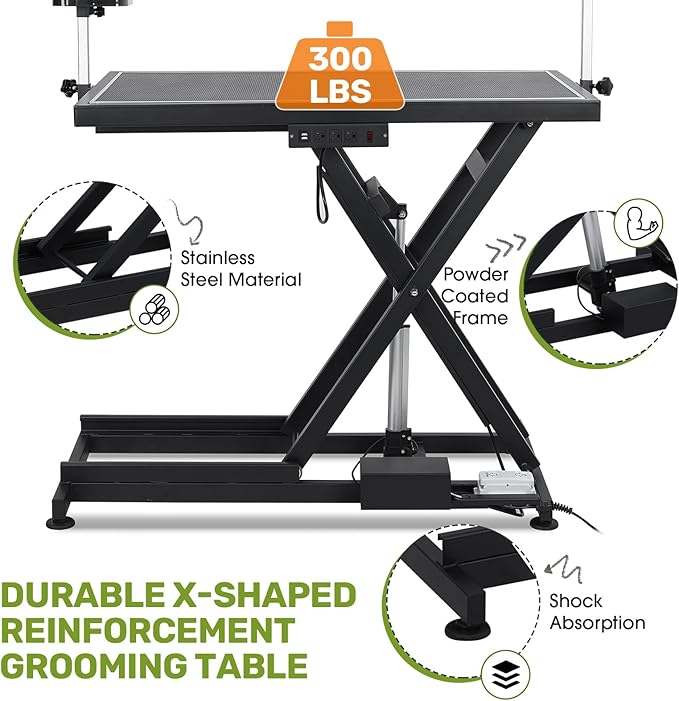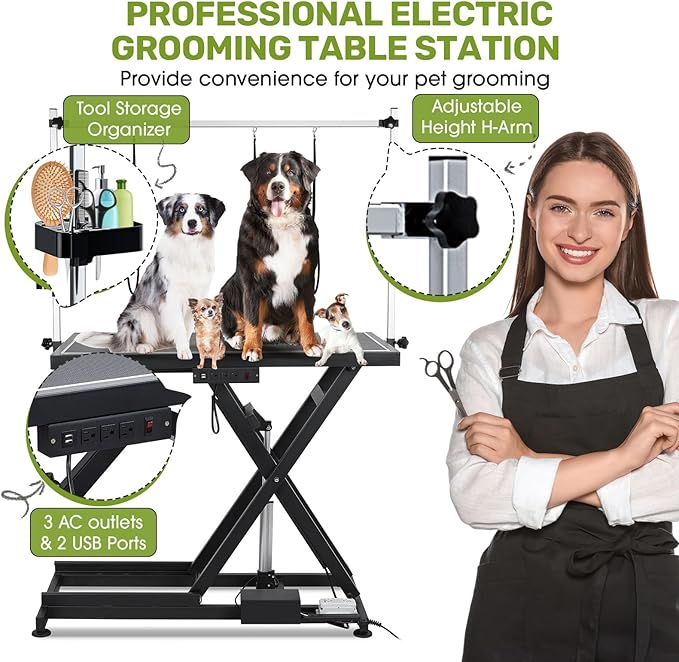 - [Fusional&Convenient Feature]Our dog grooming station complete accessories included:1 * foot controller, 3 * beauty rope, 2 AC Outlets with USB ports, 1 * Tool Storage Organizer.Our table comes with the required instructions and hardware and is easy to set up, helping you save a lot of time and effort.