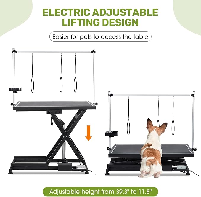 - [X-Type Frame and Height Adjustable Design]Heavy Duty Professional X-Type Electric Lift Dog Grooming Table features foot pedals for smooth and quiet 11.8"-39.4" height adjustment