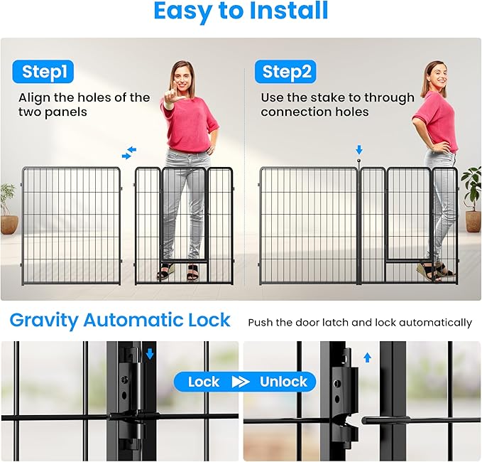 - 【Upgraded Dog Playpen】Playpen dog for medium dogs adopts gravity door lock design, much safer and more convenient. Made of heavy duty metal panels and stakes with black coating, non-toxic, anti-rust. Ensures long time use no matter indoor or outdoor.