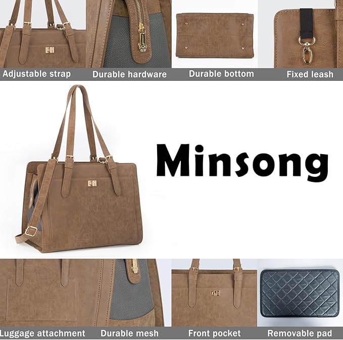 - 🐕[ Elegant Designer Pet Carrier ] Minsong pet carrier purse would be a luxury carrier designed for small pets, such as dogs ,puppy and cats, and would incorporate the signature elements of fashion style. The pet carrier purse have leather handles and a detachable shoulder strap for easy carrying. It also include additional features such as pockets for storing pet accessories or a removable pad for easy cleaning.