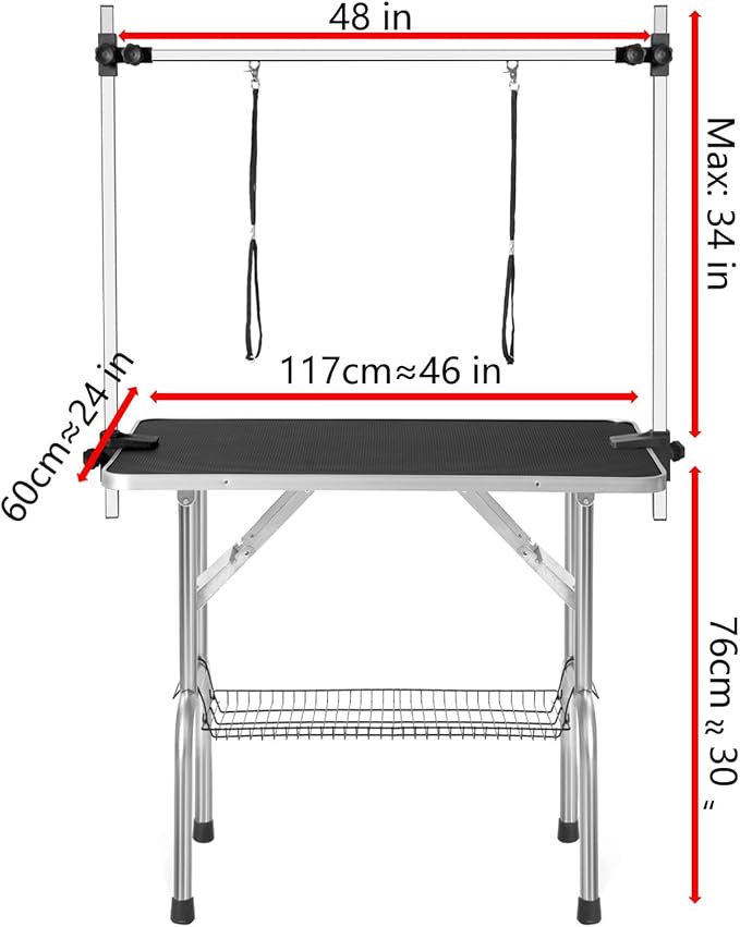 - Versatile Design: Dog grooming station equipped with an adjustable grooming arm and security nylon loop for securing dogs of various sizes, offering flexibility and convenience in grooming sessions.