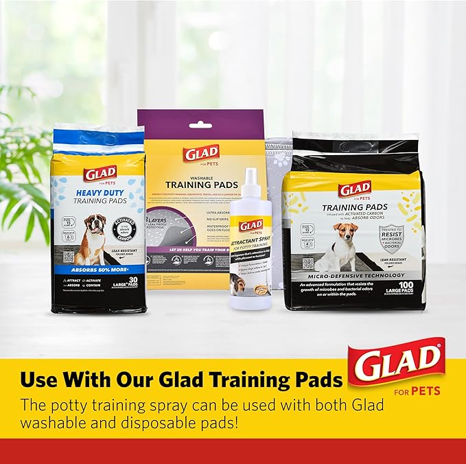 - USE WITH TRAINING PADS - The potty training spray can be used with both Glad washable pads after each wash, as well as with disposable training pads to boost the attractant and help transition pups to outdoor relief zones.