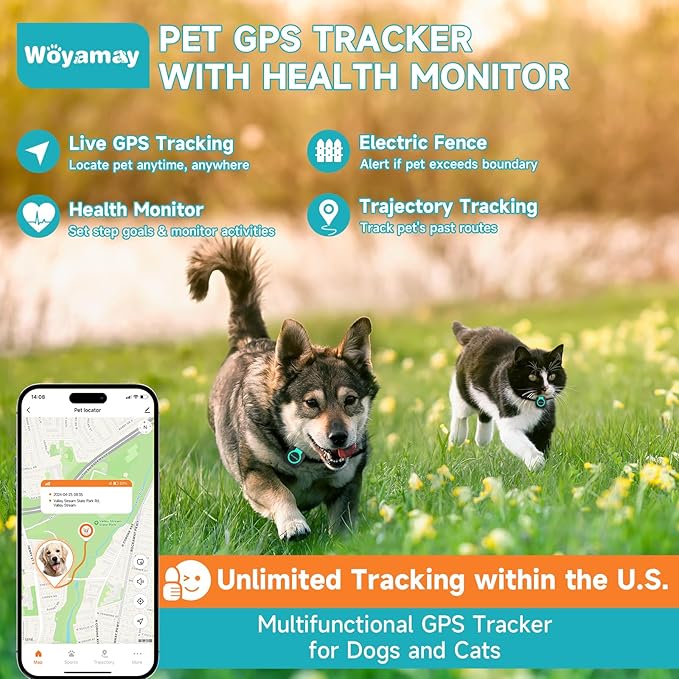 - Multi-Function Pet GPS Tracker: The Woyamay multifunctional GPS tracker for dogs and cats featuring live GPS tracking, health monitoring, eletric fences, trajectory tracking, and multi-user sharing. This all-in-one GPS cat and dog tracker ensures your pet’s safety and well-being around the clock, providing peace of mind whether you're at home or on the go