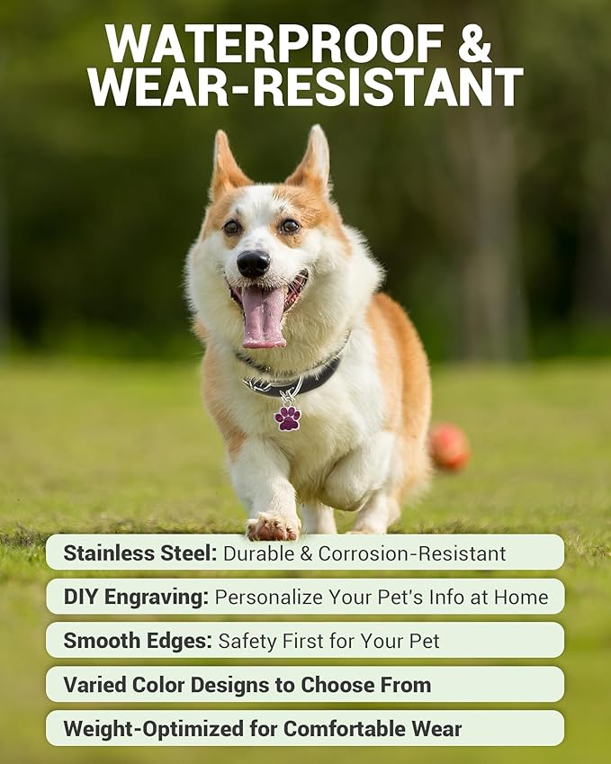 - SHIMMERING PAW PRINT ID TAGS: Specifically designed for dog tag and cat tag, these dog ID tags feature a charming glittering paw print design that glistens beautifully in the sunlight. The reverse side presents a pristine silver finish, perfectly prepared for engraving your pet’s name, pertinent details, and your contact information.