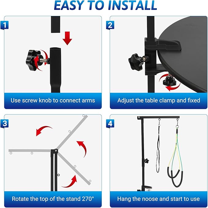 - ๐๐๐ฌ๐ฒ ๐๐ง๐ฌ๐ญ๐๐ฅ๐ฅ๐๐ญ๐ข๐จ๐ง & ๐ ๐จ๐ฅ๐๐ข๐ง๐ ๐๐๐ฌ๐ข๐ ๐ง: With easy-to-follow instructions, you can install and clamp the grooming arm onto pet grooming table in just 5-8 minutes. When you're done, simply fold it up and store it away to save space.