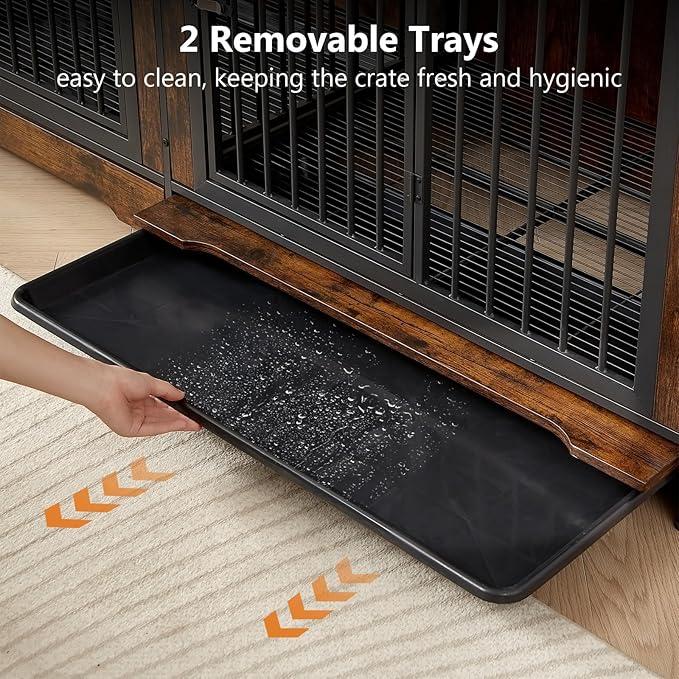 - 2 Concealed Trays - Our dog crate table is equipped with two washable trays discreetly located at the bottom, easily accessible by opening the hinge. This design not only enhances the aesthetic appeal with the wooden strips but also offers convenience for cleaning up pet hair and food.