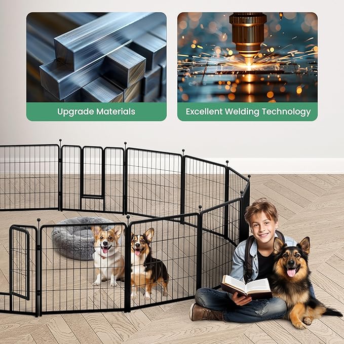 - 【Upgraded Dog Playpen】Dog playpen outdoor adopts gravity door lock design, much safer and more convenient. Made of heavy duty metal panels and stakes with black coating, non-toxic, anti-rust. Ensures long time use no matter indoor or outdoor.